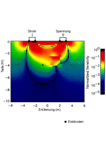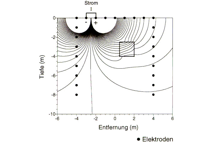 Bei den geoelektrischen Verfahren wird dem Untergrund über Elektroden ein schwacher Gleichstrom zugeführt. Mit Hilfe von Sonden wird das entstehende, stationäre Potentialfeld erfaßt, das durch die Leitfähigkeitsverteilung im Untergrund beeinflußt wird. Mit geeigneten Modellrechnungen läßt sich aus den Meßwerten die Verteilung des wahren spezifischen Widerstandes im Untergrund unter dem Sondierungspunkt, entlang eines Profils oder in einem Schnittbild bestimmen. Hieraus lassen sich geologische Schichtungen, Grundwasserleiter, Kontaminationen, Hohlräume und unterirdische Bauwerke ableiten.