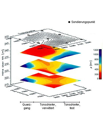 Verknüpfung mehrerer geoelektrischer Meßergebnisse zu einer dreidimensionalen Darstellung des Baugrundes [FI-DMT98] |