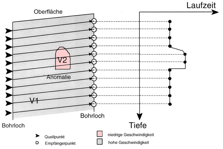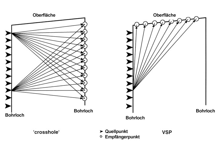 Hierbei befinden sich die Quellpunkte in einem Bohrloch und die Empfänger im gegenüberliegenden Bohrloch sowie an der Oberfläche. Anzahl und Abstand der Quell- und Empfängerpunkte sind abhängig von der Größe der zu suchenden Objekte.