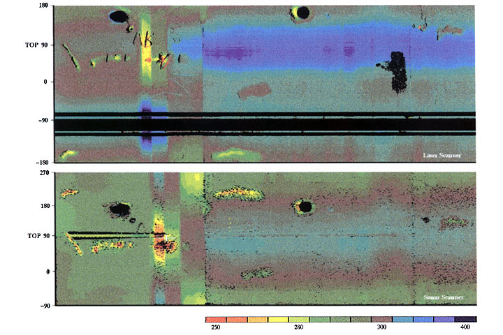 Ein neu entwickeltes Meßsystem, welches die Laser- bzw. Ultraschallmessung kombiniert, wurde im Rahmen des PIRAT-Projektes (Pipe Inspection Rapid Assessment Technique) durch CSIRO, Australien und Melbourne Water entwickelt [Campb95] . Bei dieser Technik werden die innere Geometrie der Kanäle (einschließlich Schäden) vermessen und anschließend die Daten mit Hilfe moderner Computermethoden analysiert, identifiziert und klassifiziert. Die Oberflächengeometrie wird, abhängig vom Wasserstand wahlweise durch einen Laserscanner (Luft) oder einen Echolotscanner (unter Wasser) aufgenommen und als Mantelfläche in der Ebene dargestellt (Bild 4.3.2.3.2-1) (Bild 4.3.2.3.2-2) .