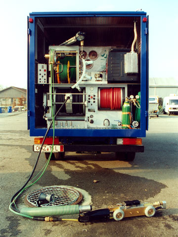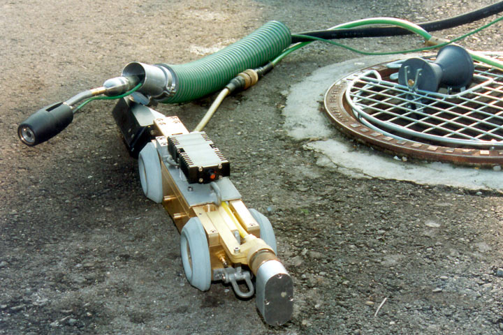 Für den Vorschub der Satellitenkamera in den Anschlußkanal kann auch eine biegsame Welle oder ein hydraulischer Antrieb in Form einer Hochdruckwasserstrahldüse (Bild 4.3.2.1.2.1-6) (Bild 4.3.2.1.2.1-7) eingesetzt werden [FI-Jtele] .