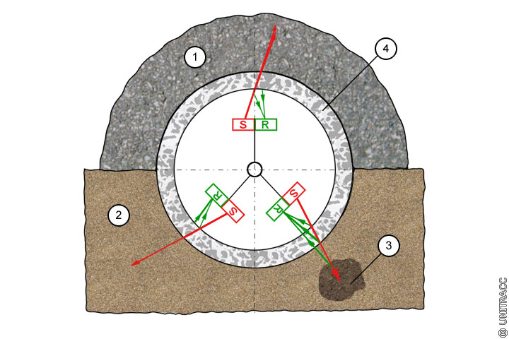 Erste Erfahrungen liegen über das sogenannte "Impuls-Echo-Georadar" vor. In [Lenz97] wird über ein erfolgreich durchgeführtes Pilotprojekt berichtet, in welchem es in einer 6 m langen, unterschiedlich gebetteten Versuchsleitung aus Steinzeugrohren DN 300 unter bekannten definierten Randbedingungen eingesetzt wurde. Bettungsunterschiede zwischen Sand und Beton wurden erfaßt. Die Antenne und der Empfänger hatten Abmessungen von 170 x 180 x 48 mm (LxBxH) und wurden an einem kleinen Rohrwagen befestigt, der mittels einer selbstfahrenden TV-Fernsehkamera durch die Versuchsleitung gefahren wurde [Lenz97] .