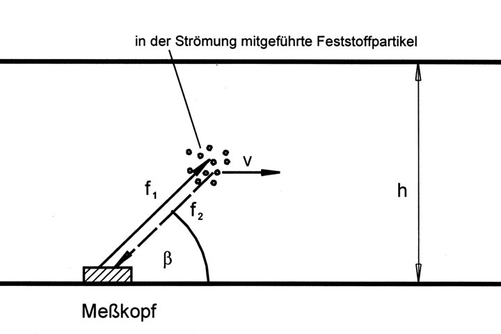 Sensoren und Meßgeräte, die die maximale Geschwindigkeit in einem Strömungsprofil detektieren sollen, arbeiten im Abwasser gewöhnlich nach dem Ultraschall-Dopplerprinzip. Doppler-Messungen beruhen auf der Reflexion an Festpartikeln in der Strömung, die im Abwasser immer vorhanden sind. Der Sensor durchschallt den Querschnitt in einem Winkel β (Bild 4.4.2.2.3.1-1) nach oben. Durch die Eigenbewegung der reflektierenden Teilchen im Abwasserstrom wird die Sendefrequenz f1 um einen Betrag verschoben, der proportional zu der Eigengeschwindigkeit des Reflektors ist. Den Empfänger erreicht aus dem durchschallten Bereich ein Bündel unterschiedlicher Frequenzinformationen f2 , aus dem im Meßumformer mit Hilfe von Fourier-Transformationen oder statistischen Verfahren die maximale Dopplerverschiebung bestimmt wird.