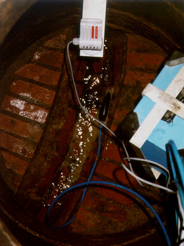 Das Echolot wird bei Messungen in der Kanalisation häufig im Einsteigschacht, manchmal auch am Scheitel einer Rohrleitung größeren Durchmessers angebracht (Bild 4.4.2.1.2-2) . Die Befestigung bleibt häufig der Improvisation des Anwenders überlassen, wenn der Hersteller keine geeigneten Hilfsmittel zum Einbau in Kanäle und Schächte bereitstellt.