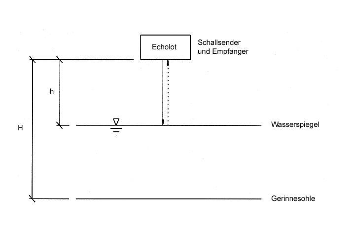 Der Standard-Meßwertaufnehmer zur berührungslosen Fließtiefenmessung ist das Ultraschall-Echolot. Das Meßprinzip basiert auf der Reflexion gepulster Ultraschallsignale von der Wasseroberfläche (Bild 4.4.2.1.2-1) .