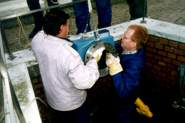Mit einer Nennweite des MIDs von DN 125 kann das Hassinger-MID-Meßrohr Abflüsse bis etwa 50 l/s messen und, begrenzt durch den unvermeidlichen Rückstau im Kanal, mit einem MID DN 200 bis zu 100 l/s. Meßeinrichtungen nach diesem Prinzip werden in ihrer Leistungsfähigkeit sehr stark durch die Platzverhältnisse im Einsteigschacht und das Eigengewicht begrenzt. Das Hassinger-MID-Meßrohr mit einem MID DN 200 wiegt bereits über 50 kg und muß teilweise im Schacht zusammengefügt werden (Bild 4.4.1.5.2.2-2) .