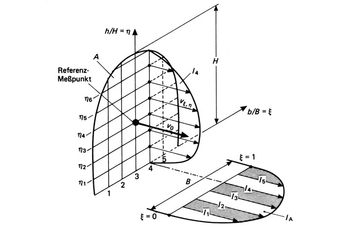 Eine weitere Meßmethode, die ohne Querschnittseinengung auskommt, ist die Netzmessung. Bei diesem Verfahren werden ebenfalls zwei Größen zur Bestimmung des Volumenstroms benötigt: zum einen die Fließtiefe, über die die durchflossene Fläche berechnet wird, zum anderen die mittlere Fließgeschwindigkeit im Gerinne. Zur Ermittlung des Geschwindigkeitsprofils werden innerhalb eines hydraulisch angepaßten Rasters im Gerinne Einzelgeschwindigkeiten gemessen. Die mittlere Fließgeschwindigkeit wird durch Planimetrie oder numerische Integration der durch die einzelnen Geschwindigkeitsvektoren aufgespannten Flächen über den durchflossenen Querschnitt ermittelt (Bild 4.4.1.5.1.3.3-1) [Kölli] [VDIVDE2640] .