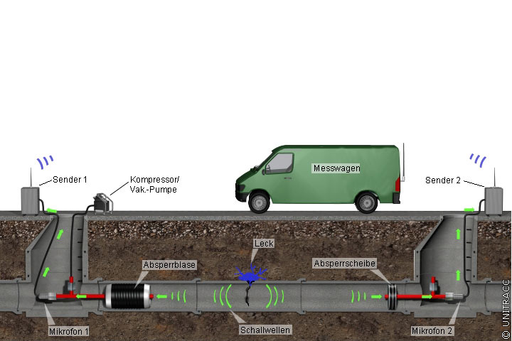 Bei der letztgenannten Methode wird der zu untersuchende, außer Betrieb gesetzte und völlig entleerte Leitungsabschnitt mit Prüfverschlüssen oder Absperrblasen abgedichtet und mit Druckluft (Abschnitt 4.5.1.2) beaufschlagt. Mit Hilfe zweier in den Prüfverschlüssen integrierter Gasschallaufnehmer (Mikrophone) wird ein infolge der durch die Undichtigkeit (Leck) entweichenden Luft erzeugtes Geräusch in elektrische Signale umgewandelt.