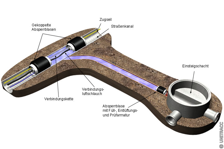 Absperrblasen für abschnittsweise Wasserdichtheitsprüfung mit Verbindungskette, -luftschlauch und Entlüftungsarmatur [FI-KMG] |