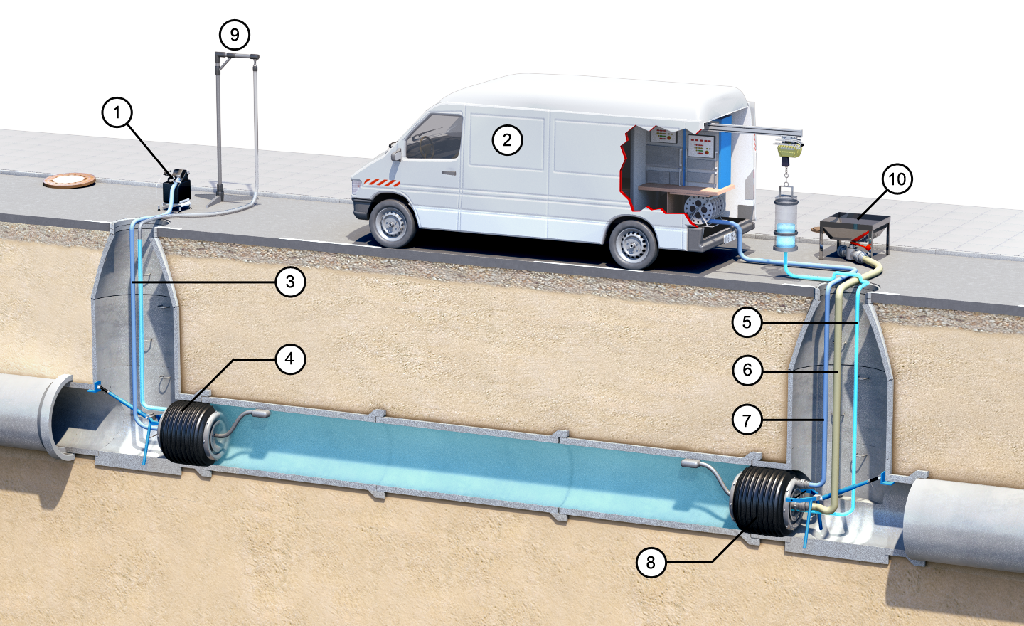 Das Prinzip einer solchen Prüfung zeigen (Bild 4.5.1.2-1) und (Bild 4.5.1.2-2) . Der beidseitige Abschluß der Haltung erfolgt mit Absperrelementen in denen Anschlüsse für Druckluft zum Aufblasen der Gummiabdichtungen der Absperrelemente sowie zur Befüllung des Prüfraumes mit dem Prüfmedium und dessen Entlüftung sowie zur Druckkontrolle integriert sind.