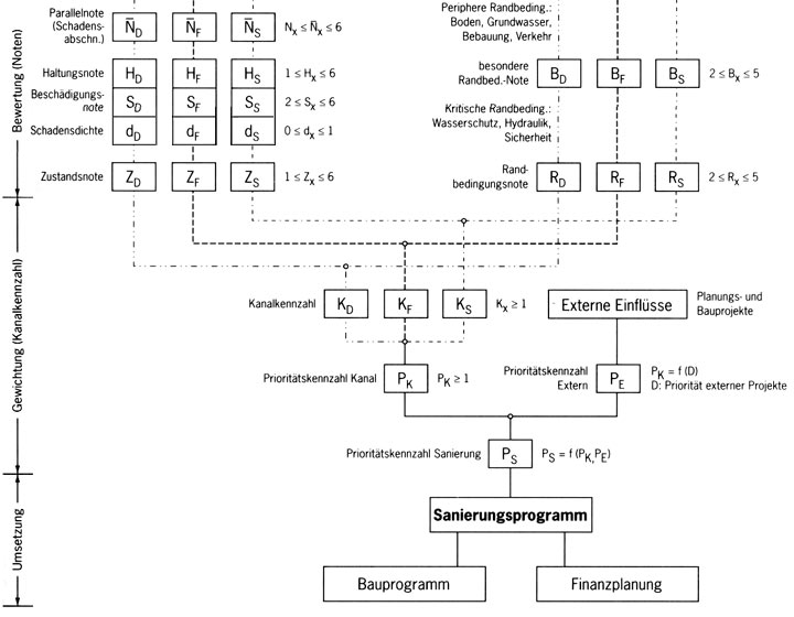In einem letzten Schritt wird, um Sanierungsprioritäten zu erhalten, die Kanalkennzahlen so miteinander verknüpft, daß eine gewichtete, die Bewertung zusammenfassende Prioritätskennzahl abgeleitet wird (Bild 4.7.4.5-1) (Bild 4.7.4.5-2) .