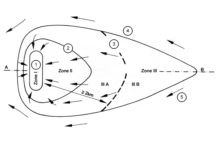 Die Zone III reicht von der Grenze des Einzugsgebietes bis zur Außengrenze der Zone II. Wenn das Einzugsgebiet weiter als 2 km reicht, so kann eine Aufgliederung in eine Zone III A bis etwa 2 km Entfernung ab Fassung und eine Zone III B etwa 2 km bis zur Grenze des Einzugsgebietes zweckmäßig sein.