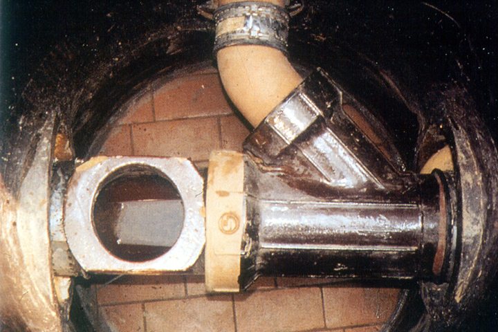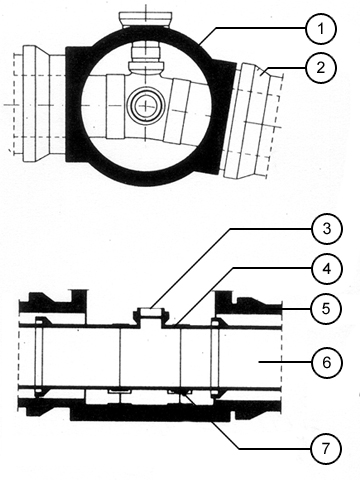 Eine kontinuierliche qualitative Dichtheitsprüfung ist bei doppelwandigen Kanälen mit offen in den Schacht einmündenden Mantelrohren (Bild 6.4.2.3-1) (Bild 6.4.2.3-2) durch Beobachtung des Sammelraumes im Schacht möglich [Menne90] . Es ist jedoch zu berücksichtigen, daß eventuell auftretendes Kondens- oder Oberflächenwasser im Falle undichter Schachtabdeckungen falsche Inspektionsergebnisse zur Folge haben kann.