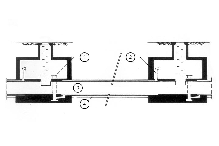 Doppelwandiges Kanalsystem mit Ringraum zwischen Mantel- und Produktrohr (Medienrohr) im Bereich der Schächte abgedichtet [ATVA142:1992] |