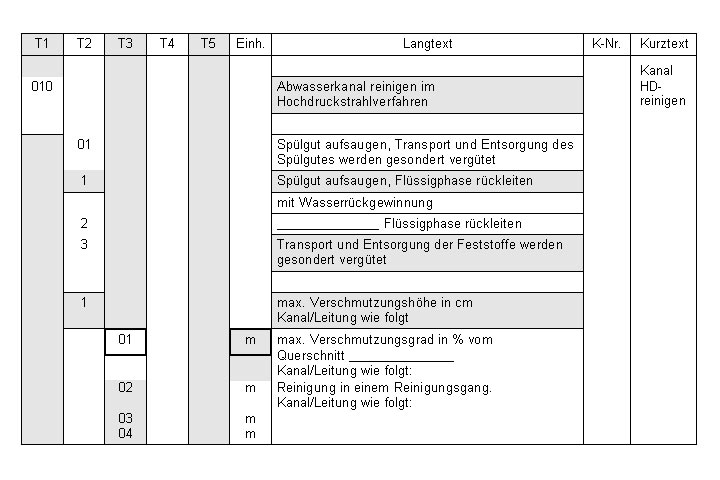 Einen Auszug zeigt (Bild 5.6.3.2.4.4-1) für die Leistung "Abwasserkanal reinigen mit HD-Verfahren". Die Standardleistungsnummer (StL-Nr.) lautet: StL-Nr. 96 309/010 11 01.
