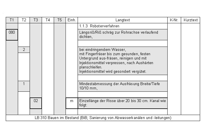 Einen Auszug aus dem LB 310 zeigt (Bild 5.6.3.2.4.5-1) für die Leistung "Längsriß/Riß schräg zur Rohrachse verlaufend dichten". Die Standardleistungsnummer lautet: StL-Nr. 310/080 21 02.