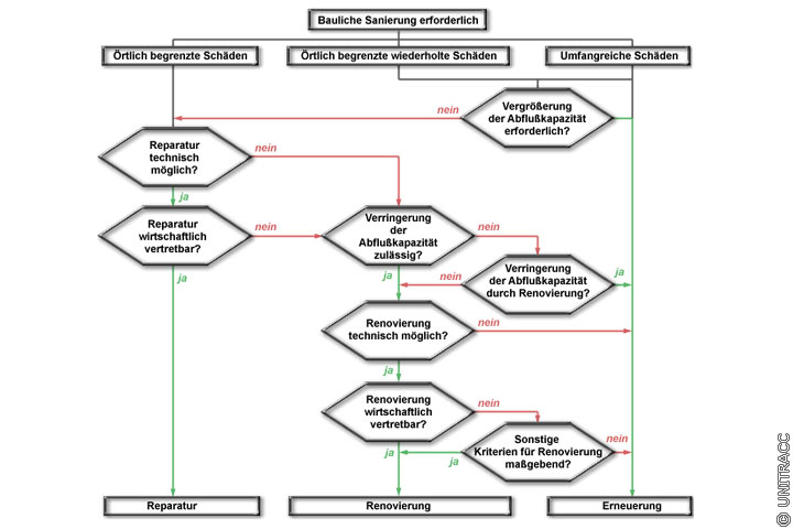 Aus wirtschaftlichen Gründen werden örtlich begrenzte Schäden durch Reparatur behoben. An derselben Stelle wiederholt auftretende und umfangreiche Schäden, bei denen eine Reparatur nicht mehr möglich ist, können sowohl durch Renovierung als auch durch Erneuerung behoben werden. Kann eine hydraulische Überlastung oder eine Querschnittsreduzierung durch eine Renovierungsmaßnahme nicht in Kauf genommen werden, kommt nur eine Erneuerung in Betracht.