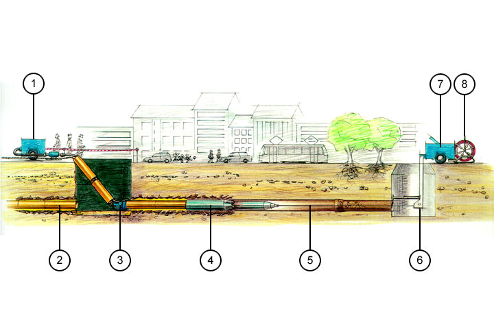 Der Grundgedanke der Anfang der 80er Jahre entwickelten Berstverfahren, im englischen Sprachgebrauch mit "Pipe-Bursting" bezeichnet, ist, einen Berstkörper mit Hilfe einer Seilwinde oder eines Zuggestänges durch den defekten, außer Betrieb gesetzten Kanal zu ziehen, der die Rohrwandung von innen zerstört und in den umgebenden Baugrund verdrängt. Unmittelbar hinter dem Berstkörper wird ein neuer Kanal gleicher oder größerer Nennweite eingezogen. Es ist somit keine Bodenentnahme erforderlich. Diese Arbeiten können je nach Verfahrensvariante von den Schächten oder speziell hergestellten Startbaugruben aus durchgeführt werden [Stein88e] (Bild 5.4.3.5-1) .