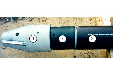 Bei dem jeweils verwendeten Berstkörper handelt es sich entweder um einen modifizierten Bodenverdrängungshammer (BVH) [Stein88c] [Stein95e] [Emery84] [Jones84b] [Jones86] [ORour85b] [Poole85] [WRC83] [Stein82c] [Winne86] [Stein88e] oder um einen BVH mit einem vorn oder hinten angeordneten speziellen Aufweitungskonus (Bild 5.4.3.5.1-2) (Bild 5.4.3.5.1-3) (Bild 5.4.3.5.1-4) (Bild 5.4.3.5.1-5). Im Gehäuse des BVH befindet sich ein Schlagkolben, der mit Hilfe von Druckluft angetrieben wird und dessen Schlagimpulse in erster Linie das Zerstören des Altkanals und das Verdrängen der Bruchstücke in den Baugrund bewirken. Die Richtungsstabilität wird unterstützt durch die Länge des Berstköpers und durch die über eine Seilwinde oder ein Gestänge aufgebrachte Zugkraft in der Zielbaugrube. Trotz dieser Maßnahmen kann es infolge von Inhomogenitäten im Bereich der Leitungszone, aber auch bei größeren Abwinkelungen des zu erneuernden Kanals zu Abweichungen kommen.