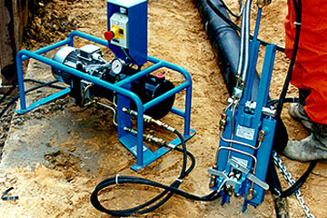 Dynamisches Rohrberstverfahren in Kombination mit dem Einziehen von Einzelrohren [FI-Tracta] - Hydraulik-Antriebsstation und SPANNFIX zum Spannen der Zugkette