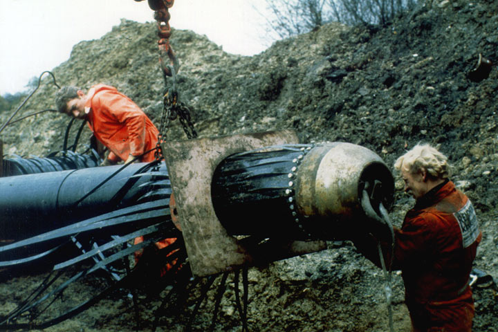 Die Leitungserneuerung unter Ausnutzung dynamischer Krafteinleitung (Animation 5.4.3.5.1-1) wurde von der British Gas Corporation, England [FI-Britia] , für den Gassektor entwickelt (Europ. Patent Nr. 0053480) (Bild 5.4.3.5.1-1) und später auf den Abwassersektor übertragen. Basierend auf dieser Entwicklung wurden international, aber auch in der Bundesrepublik Deutschland ähnliche Verfahrens- und Maschinenentwicklungen [FI-Ryan] [FI-DIGA] [FI-Tracta] [FI-Terrab] [FI-Broch] betrieben, so daß heute verschiedene Systeme zur Verfügung stehen.