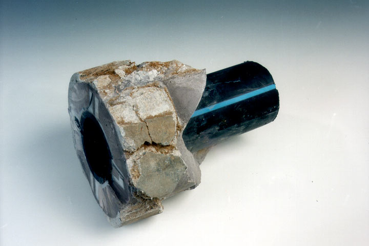 Eine weitere Möglichkeit stellt das Aufbringen einer äußeren Schutzschicht (Schutzmantel) auf die neuen Rohre dar. Von Rogers [Roger90] wurden solche Schutzschichten aus Hart-Polyurethan und GFK mit einer Dicke von 2-3 mm erfolgreich getestet. Ein Vertreter dieses Rohrtyps ist z. B. das PE-HD-Berstliningrohr TRACTO/BOTEC mit aufextrudiertem Schutzmantel [FI-Tracta] .
