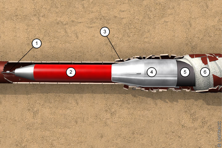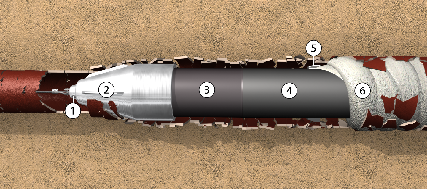 Eine Beschädigung der Produktrohrleitung und deren Beanspruchung durch Einzel- und Linienlasten werden sicher durch den 2-phasigen Einbau verhindert. Hierbei werden mit Hilfe des Berstkörpers zunächst Mantelrohre eingezogen, in die in einem zweiten Arbeitsschritt die neue Produktrohrleitung verlegt wird.