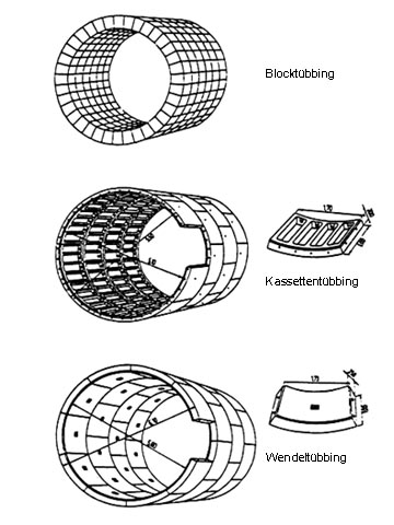 Die Auskleidung des aufgefahrenen Hohlraumes erfolgt mit Hilfe sogenannter Tübbinge. Hierbei handelt es sich um vorgefertigte Auskleidungselemente aus Beton, Gußeisen oder Stahl, die im Schutze des Schildschwanzes unter Einschub eines keilförmigen Schlußsteins zu Ringen zusammengesetzt werden (Bild 5.4.3.2-2) .