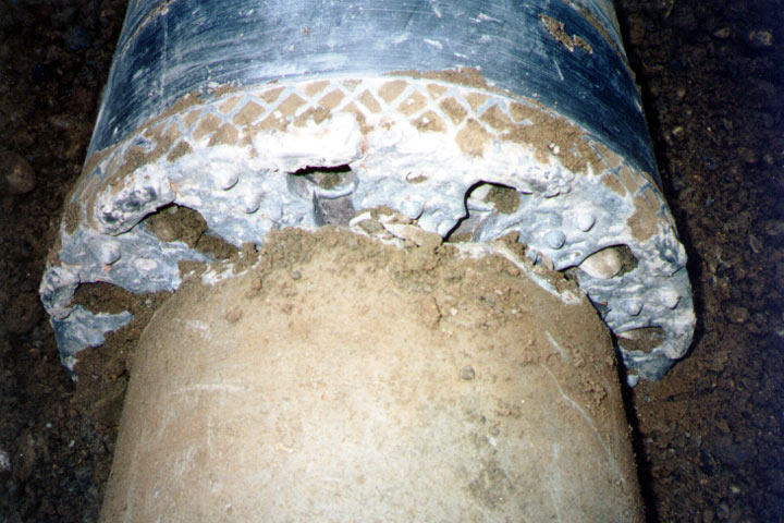 Ein etwas anderer Weg wurde mit dem AVP-Crush-Lining [FI-Herreb] verfolgt. Hierbei handelt es sich um ein nichtsteuerbares Verfahren auf der Basis des Preßbohr-Rohrvortriebes (Bild 5.4.3.4-11) (Bild 5.4.3.4-12) (Bild 5.4.3.4-13) (Bild 5.4.3.4-14) (Bild 5.4.3.4-15) (Bild 5.4.3.4-16) (Bild 5.4.3.4-17) [Stein88c] [Stein96a] [ATVA125:1996] .