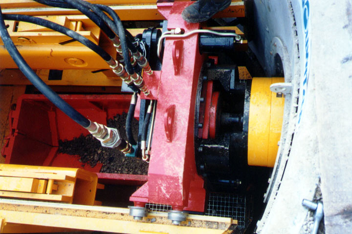 Der konisch ausgebildete Bohrkopf ist mit Rollenmeißeln und hartmetallbewehrten Rundschaftmeißeln sowie einem integrierten Exzenterbrecher ausgerüstet. Der Abtransport des gelösten Bodens und des zerkleinerten Altrohres erfolgt in der Maschinengrundversion mit einem Schneckenförderer mit separatem Antrieb unabhängig vom Bohrkopf. Alternativ steht eine pneumatische Saugförderung zur Verfügung (Bild 5.4.3.4-3) (Bild 5.4.3.4-4) (Bild 5.4.3.4-5) (Bild 5.4.3.4-6) (Bild 5.4.3.4-7) (Bild 5.4.3.4-8) (Bild 5.4.3.4-9) (Bild 5.4.3.4-10).