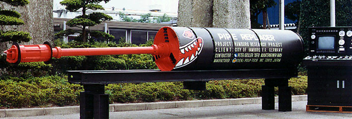 Die Vortriebsmaschine verfügt über einen Spezialbohrkopf mit integriertem, pneumatisch angetriebenem Bohrhammer, der den Abbau und die Zerkleinerung des Altrohres durch den Bohrkopf unterstützt. Der Materialtransport erfolgt im Bereich des Bohrkopfes pneumatisch durch die Abluft des Hammers; im Maschinenrohr findet die Übergabe des abgebauten Materials auf Förderschnecken zum Weitertransport zur Startbaugrube statt [Zapel98] . Die Führung der Vortriebsmaschine erfolgt über einen vorlaufenden Pilotkopf, welcher sich im Altrohr zentriert und zusätzlich dessen unkontrollierten Einsturz während des Vortriebes verhindern soll. Ein über ein Gestänge mit dem Pilotkopf verbundener Abdichtungskörper verhindert das unkontrollierte Entweichen der Abluft über den Altkanal.