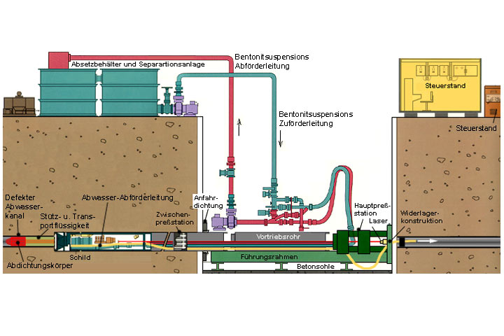 Die Verbindung zum Bohrkopf erfolgt über eine Stahlrohrleitung. Diese dient primär als Distanzhalter für den Abdichtungskörper, damit dieser in jedem Fall außerhalb möglicher, vortriebsbedingter Riß- und Rohrbruchbereiche liegt. Darüber hinaus besteht die Möglichkeit, sie als Saugleitung zur Ableitung des vor dem Abdichtungskörper angestauten Abwassers zu nutzen, wenn ein Teilbetrieb während der Erneuerung aufrechterhalten werden muß. In diesem Fall wird das Abwasser mittels einer in der Startbaugrube installierten, stufenlos regelbaren Pumpe über eine Öffnung an der Spitze des Abdichtungskörpers angesaugt, durch den Maschinenkörper geführt und über eine Sonderleitung in den Vorflutkanal gepumpt. Die Länge des Abdichtungskörpers bzw. der Abstand der beiden Dichtungsmanschetten ist so dimensioniert, daß auch bei größeren Rohrschäden die Stützflüssigkeit der Suspensionskammer nicht in den vorderen Kanalbereich entweichen kann. Die im Nennweitenbereich ≥ DN 250 einzubauenden Vortriebsrohre haben eine Baulänge von 2000 mm.