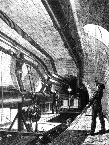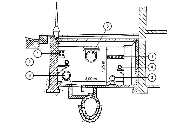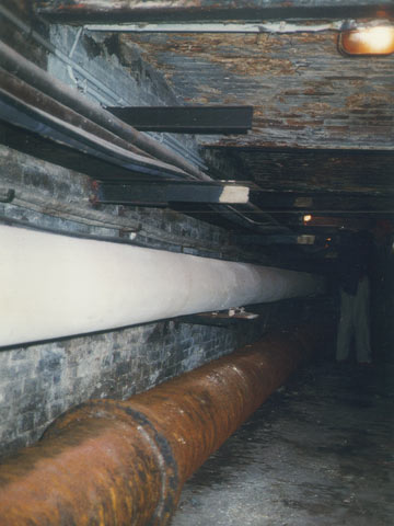 Die ersten begehbaren Leitungsgänge wurden bereits im vergangenen Jahrhundert in London (1869) und Hamburg [Hobre90] [Roepe93] (Bild 5.4.4-7) (Bild 5.4.4-8) errichtet. Die Begründung gab Frühling im Jahre 1910 [Frühl10] : "In der englischen Hauptstadt liegen insofern besondere Verhältnisse vor, als nicht allein der Verkehr beständig wächst, sondern auch die Versorgungsnetze im Besitz verschiedener Gesellschaften sind, denen - und zwar jeder für sich - vom Parlament das Recht verliehen ist, auch ohne behördliche Erlaubnis das Pflaster für ihre Zwecke aufzubrechen. Anlagen, welche die hiermit verbundenen Verkehrsstörungen beseitigen, sind deshalb in London mehr als anderswo am Platze."