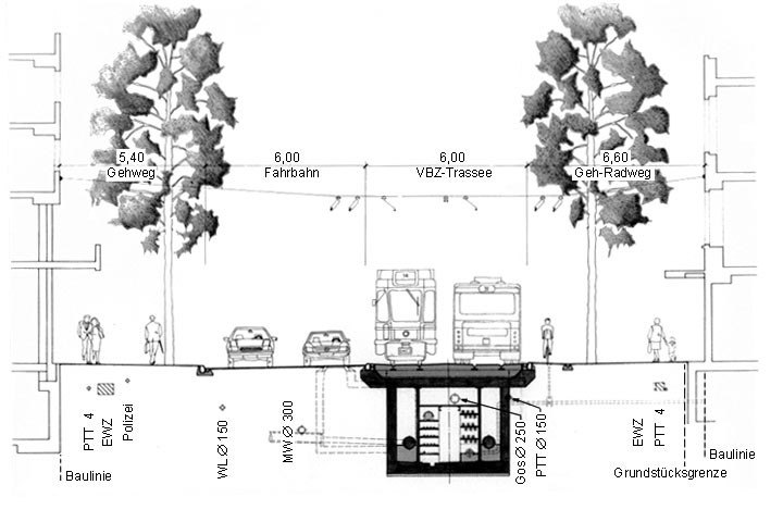 - Die einzelnen unterirdischen Anlagen unterliegen je für sich bestimmten Planungs- und Trassierungsgrundsätzen. Da sie sowohl parallel als auch kreuzend verlegt werden, kommt es stets zu Berührungspunkten. Außerdem beeinflussen sich einzelne Anlagen gegenseitig nachteilig (z.B. Elektrizitätskabel - Fernmeldekabel - Gasleitungen - Fernwärmeleitungen), so daß diesen Gesichtspunkten bei der Planung besondere Beachtung zu schenken ist. Der Raumbedarf der einzelnen unterirdischen Anlagen ist sehr unterschiedlich. Dort, wo sehr große Bauten untergebracht werden müssen, ist der Raum für die übrigen unterirdischen Anlagen stark eingeschränkt. Sorgfältigste Abstimmung ist daher notwendig.