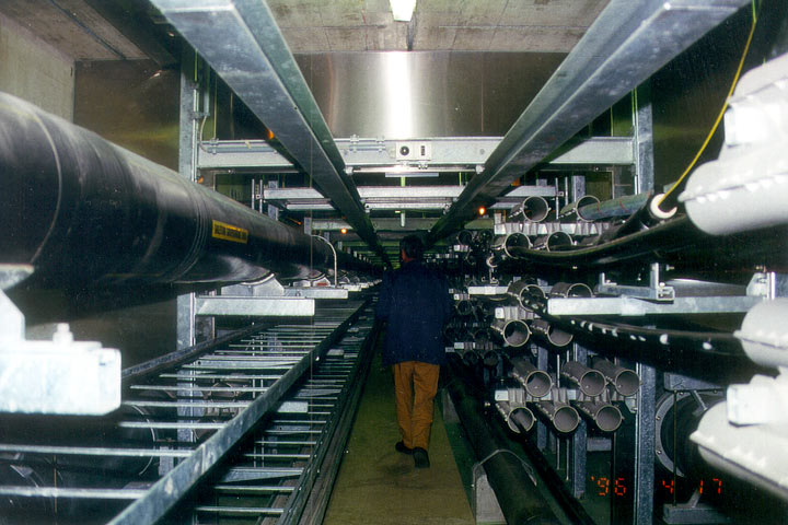Weite Verbreitung fanden Leitungsgänge in der ehemaligen DDR und der Sowjetunion, wo mehrere hundert Kilometer in standardisierten Bauweisen errichtet wurden. Aus jüngster Zeit sind vor allem Großprojekte in Taipeh und Prag zu nennen, wo damit begonnen wurde, die leitungsgebundene Infrastruktur ganzer Stadtteile mit einem Leitungsgang-System zu erneuern. In Zürich wurde 1991 eine der modernsten Anlagen dieser Art in Betrieb genommen (Bild 5.4.4-9) (Bild 5.4.4-10) (Bild 5.4.4-11) . In Westdeutschland sind Leitungsgänge bisher vor allem im nichtöffentlichen Bereich angewendet worden. Als Beispiele sind u.a. die Universitäten von Bochum und Dortmund und die Universitätsklinik in Heidelberg, aber auch Kläranlagen, Messegelände etc. zu nennen.