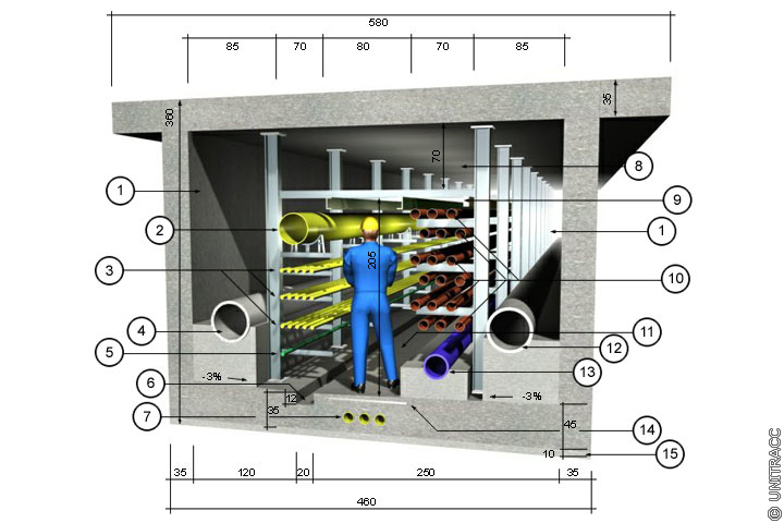 Hierbei handelt es sich um eine geschlossene, langgestreckte, begehbare bauliche Anlage zur zugänglichen Verlegung von Ver- und Entsorgungsleitungen, bestehend aus Leitunggangstrecke sowie Zugangs-, Montage-, Belüftungs-, Abzweig- und Vereinigungsbauwerken (Bild 5.4.4-3) (Bild 5.4.4-4) .