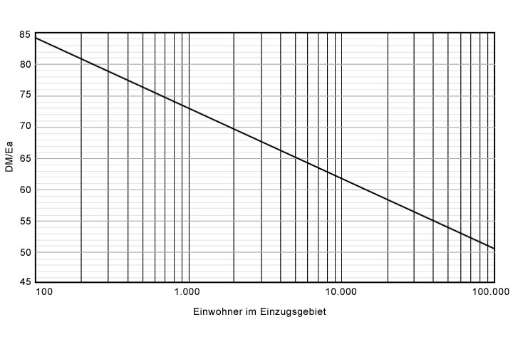 Die Angabe allgemeingültiger Kostengrößen für den Kanalbetrieb ist kaum möglich. Netzlänge, Netzalter, die Entwässerungsform und das Netzgefälle führen zu stark unterschiedlichen Kostengrößen. Pecher [Peche94] wertete Gebührenbedarfsberechnungen von 352 Städten mit einer Netzlänge von ca. 92.600 km aus und kam auf Betriebskosten für die Kanalisation von unter 30 DM/(E·a) (€ 15,34) bis über 170 DM/(E·a) (€ 86,92). Im Mittel sind etwa 117 DM/(E·a) (€ 59,82) zu erwarten, mit einem Personalkostenanteil an den Betriebskosten von etwa 40 %. Die längenbezogenen Kanalbetriebskosten wurden für die 352 untersuchten Städte im Mittel zu 17,14 DM/(m·a) (€8,92) festgestellt. Von einigen Bundesländern werden Hinweise zur Plausibilitätsprüfung vorhandener Betriebskosten für Kanalnetze gegeben. Als Beispiel diene (Bild 5.7.1-1) , aus dem in Abhängigkeit von der Zahl angeschlossener Einwohner Betriebskosten von etwa 85 DM/(E·a) (€ 43,46 )bis etwa 50 DM/(E·a) (€ 25,56) als realistische Größenordnungen hervorgehen [MUNR96] .