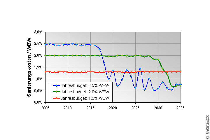 Im (Bild 5.7.1.1.1.2.1-2) ist deutlich zu erkennen, dass eine Budgetgröße von 1.3 % des Wiederschaffungswertes langfristig zu einem kontinuierlichen Substanzverzehr führt. Ein Budgeteinsatz von 2.5 % des Wiederschaffungswertes führt bis 2020 zu einem deutlichen Substanzaufbau. Da der Erneuerungsbedarf anschließend sinkt und entsprechend nicht mehr das volle Budget für Sanierungsmaßnahmen ausgenutzt zu werden braucht, sinkt der Substanzwert nach 2020. Ein relativ kontinuierlicher Substanzaufbau bis 2030 mit anschließender Konsolidierungsphase wird mit einer jährlichen Budgetgröße von 2.0 % des Wiederschaffungswertes erreicht.