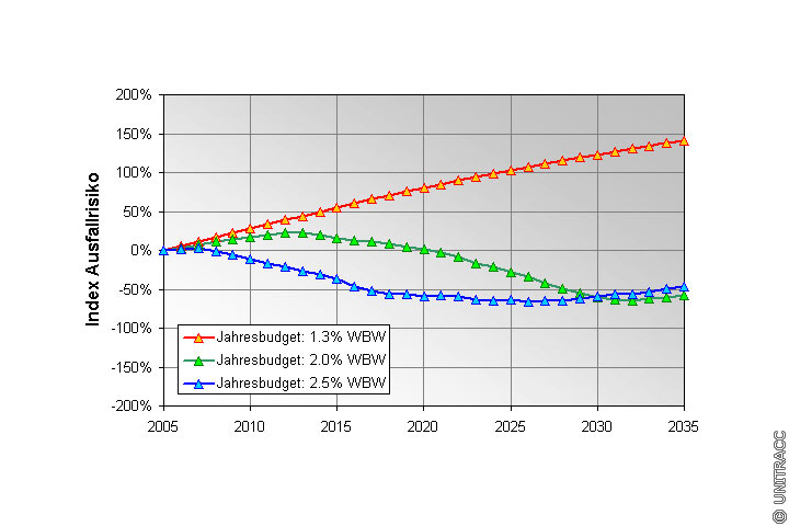 Die Ausfallrisiken im Entwässerungssystem infolge der unterschiedlichen Budgetvorgaben sind im (Bild 5.7.1.1.1.2.1-4) veranschaulicht. Dargestellt sind die relativen Veränderungen des Ausfallrisikos im Prognosezeitraum bezogen auf das Jahr 2005. Die Untersuchung zeigt, dass ein jährlicher Budgeteinsatz von 1.3 % des Wiederschaffungswertes einen deutlichen Anstieg des Ausfallrisikos verursacht. Sofern jährlich 2.0 % des Wiederschaffungswertes als Sanierungsbudget zur Verfügung stehen, kann das Ausfallrisiko ab 2020 unter das heutige Niveau gebracht werden, während ein Jahresbudget von 2.5 % des Wiederschaffungswertes durchgängig zu einer höheren Sicherheit im Entwässerungssystem führt.
