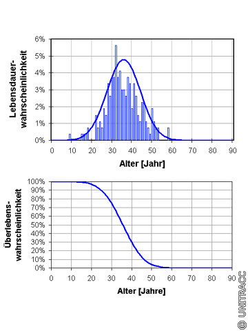 In (Bild 5.7.1.1.1.1.2-1) (oben) ist eine typische Lebensdauerverteilung in Anpassung an die Weibullverteilung abgebildet. Sie beschreibt die Wahrscheinlichkeit mit der ein Baujahrgang ein bestimmtes Alter erreicht. Die Wahrscheinlichkeit mit der ein Baujahrgang ein bestimmtes Alter überlebt wird durch die Überlebensfunktion (Bild 5.7.1.1.1.1.2-1) beschrieben. Diese wird aus dem Integral der Lebensdauerverteilung ermittelt.