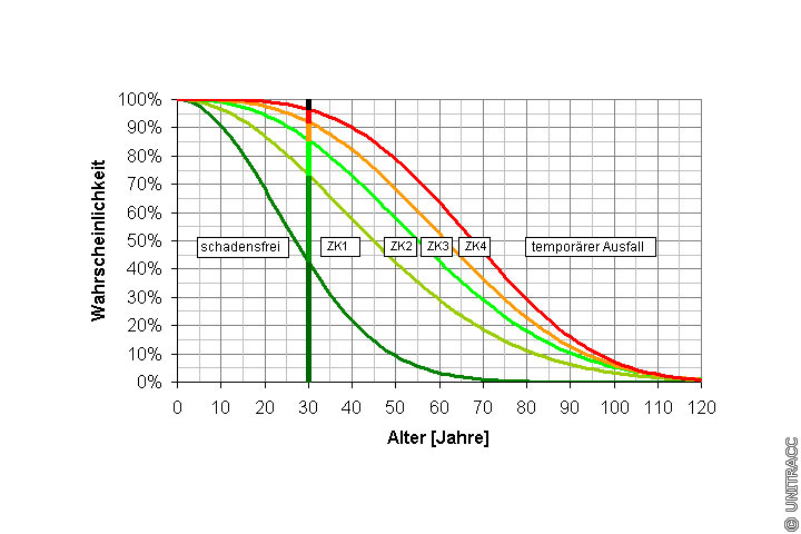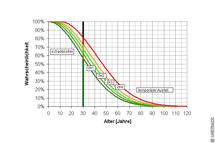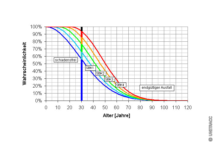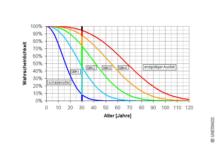 Von besonderem Interesse ist die Überlebensfunktion in dem nicht mehr zulässigen Substanzbereich "endgültiger Ausfall". Diese zeigt den völligen Abbau des Abnutzungsvorrats und damit das Ende der technischen Nutzungsdauer an. Die Wahrscheinlichkeit für einen endgültigen Ausfall beträgt hier 5,9 %.