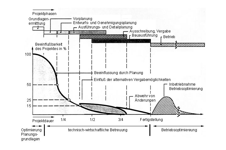 Den netzorientierten Untersuchungen stehen die Wirtschaftlichkeitsprüfungen bei konkreten Projekten gegenüber. In beiden Fällen besitzt der Eigentümer der Anlagen Entscheidungspflichten, die letztlich nicht weiterdelegiert werden können. Um so wichtiger ist die Verwendung sinnvoller Ansätze zur Wirtschaftlichkeitsprüfung. (Bild 5.7.1.1.2-1) zeigt die große Beeinflußbarkeit von Kosten insbesondere in frühen Projektstadien, also etwa bei der grundsätzlichen Festlegung der Bauverfahren [Bohn96] .