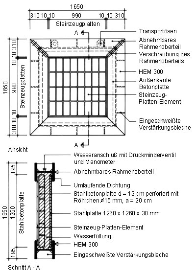 - Die Prüfkörper werden in eine Versuchseinrichtung eingelegt und mit Wasser von Raumtemperatur gefüllt. Auf sorgfältige Entlüftung ist zu achten. Dann wird der in der (Tabelle 5.3.2.1.2.1-1) vorgeschriebene Prüfdruck innerhalb von 30 Sekunden aufgebracht. Es wird festgestellt, ob die Prüfkörper in der vorgeschriebenen Prüfdauer diesen Anforderungen entsprechen. Als Versuchseinrichtung wird in [IfBt82] ein spezieller Prüfrahmen entsprechend (Bild 5.3.2.1.2.1-1) vorgestellt. Maßgebend für die Beurteilung des Ergebnisses der Prüfung ist das Ausreißen des ersten Verankerungselementes aus dem Tragquerschnitt.