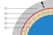 Mindestens der innenliegende Schlauch, der das spätere Gerinne des sanierten Kanals bildet, verfügt auf seiner Rückseite über Noppen (deshalb nachfolgend auch als "Noppenschlauch" bezeichnet), die als Abstandhalter zum Altrohr bzw. zum vorab installierten PE-HD-Schlauch dienen. Die Noppen definieren einen Ringraum, der mit einem hydraulisch abbindenden Injektionsmörtel verfüllt wird und dessen Wanddicke je nach gewählter Noppenhöhe zwischen 9 und 19 mm betragen kann. Ringraumverfüllung und Noppenschlauch bilden das statisch tragende Verbundsystem (Bild 5.3.2.4.2-1) .