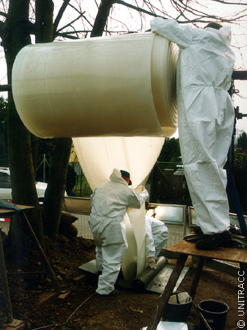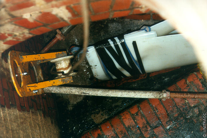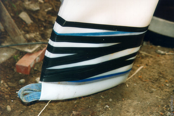 In Abhängigkeit des gewählten Systems werden, wie bereits erwähnt, ein oder mehrere auf Trommeln gewickelte Schläuche nacheinander über den Einsteigschacht in die zu sanierende Haltung eingezogen. Nach Erreichen des Zielschachtes werden die Schläuche beidseitig mit Rohrblasen abgedichtet (Bild 5.3.2.4.2.4-1) (Bild 5.3.2.4.2.4-2) (Bild 5.3.2.4.2.4-3) (Bild 5.3.2.4.2.4-4) (Bild 5.3.2.4.2.4-5) (Bild 5.3.2.4.2.4-6) (Bild 5.3.2.4.2.4-7) und mit Luftdruck so weit rückverformt, daß das Einziehen des nachfolgenden Schlauches möglich wird. Für diesen Zweck ist sowohl im Kontrollschlauch als auch im Preliner eine Hilfsleine für die Rückholung des Windenseiles integriert. Gleichzeitig wird eine Dichtheitsprüfung nach DIN EN 1610 [DINEN1610:1997] für jeden Schlauch durchgeführt (Abschnitt 4.5.1.2) . Beim innenliegenden Noppenschlauch dient die Rückverformung zur Nachbildung der endgültigen Querschnittsgeometrie. Der erforderliche Druck von ca. 0,5 bar wird mit Hilfe von Wasser oder Luft aufgebracht und bis zum Ende der Sanierungsmaßnahme aufrechterhalten.