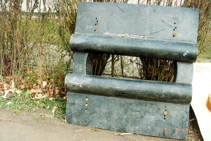 Die über der Startschachtöffnung installierte mechanische Verformungseinheit dient zum Falten des PE-HD-Schlauches vor Einführung in den zu sanierenden Kanal. Die dadurch erreichte Querschnittsreduzierung von bis zu 60 % und die damit verbundenen Steifigkeitsverluste erlauben das Umlenken des Schlauches innerhalb des Schachtes um 90° und das problemlose Einziehen. - Aufstellen der Halterung für die Schlauchtrommel