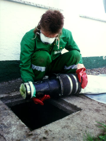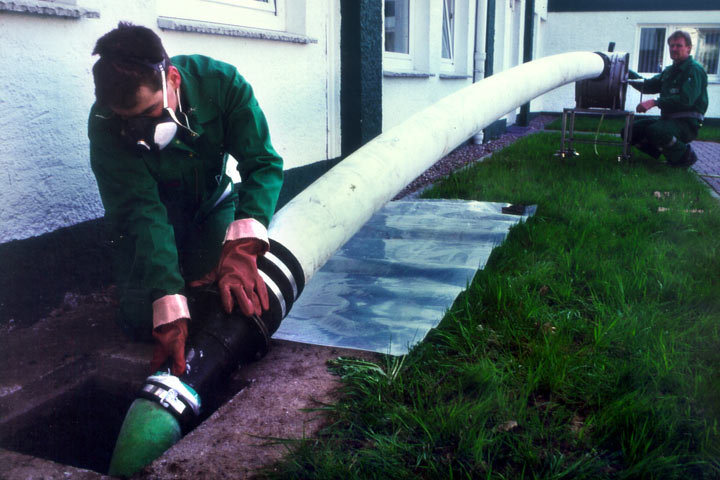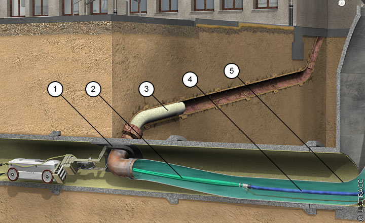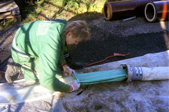 Inliner- und Kalibrierschlauch werden in einer Druckkammer mit angeschlossenem Führungsschlauch auf eine Trommel aufgewickelt. Von dort aus erfolgt über einen Einsteigschacht oder eine Reinigungsöffnung der Umstülpprozeß mit Druckluft von 0,6 bar in den Anschlußkanal und das Anpressen des Inlinerschlauches an die Rohrwand. Nach Abschluß der Kalthärtung (ca. 2 Stunden) wird der Kalibrierschlauch wieder entfernt.