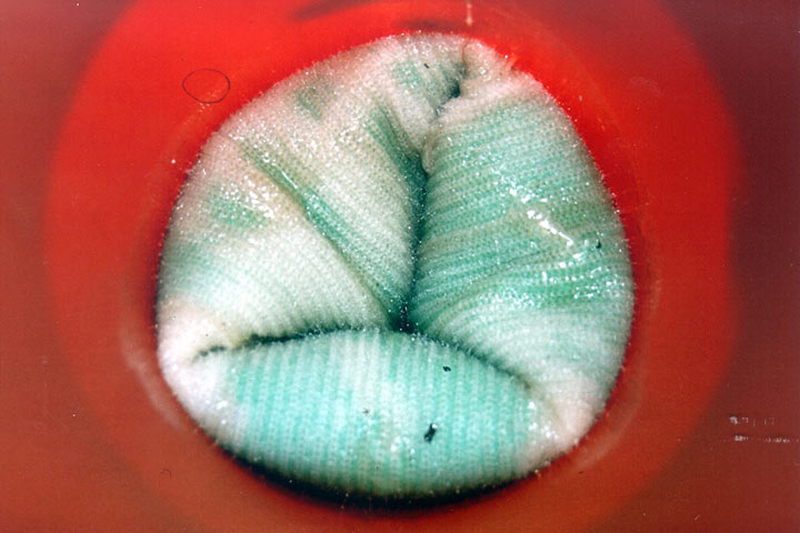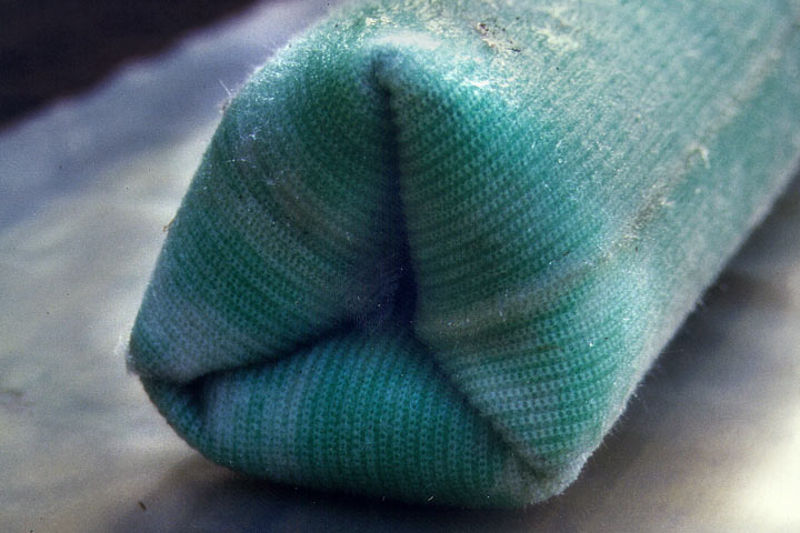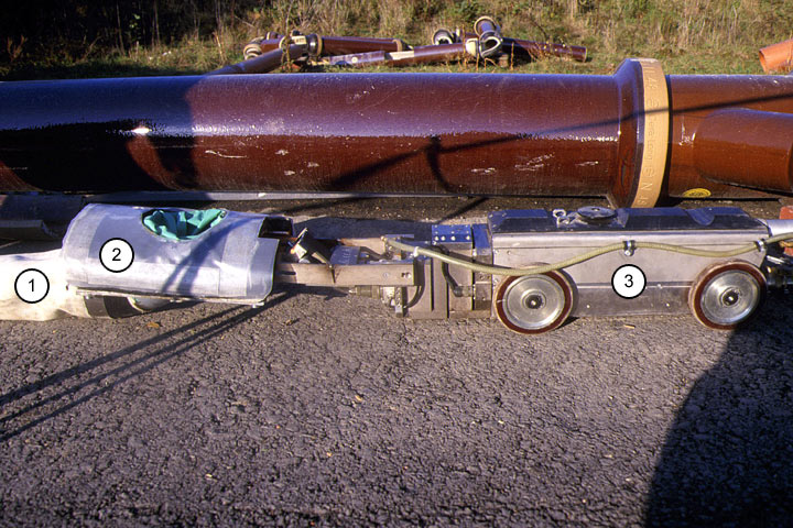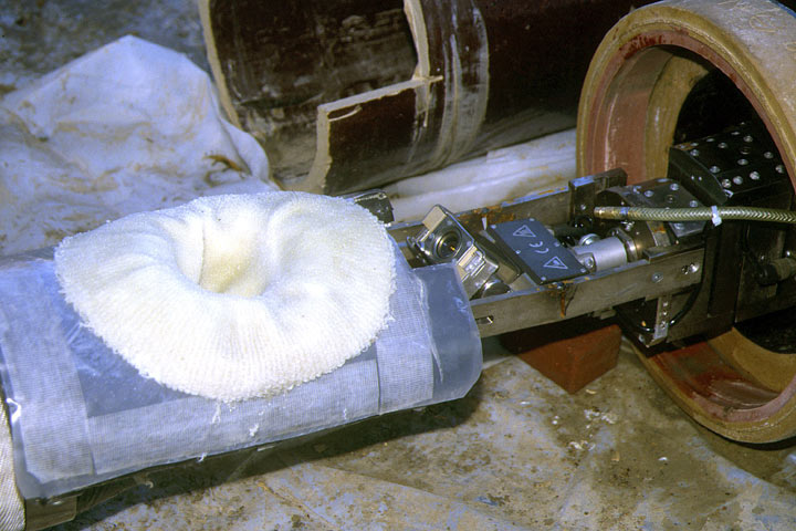 Der Inlinerschlauch besteht beim KM-Houseliner-Verfahren aus einem ca. 3 mm dicken Glasfaser-Strickschlauch, der mit eigens für die Haftung auf feuchtem Untergrund konzipiertem, kalthärtendem Epoxidharz vor Ort mit einer tragbaren Walzenanlage getränkt wird (Bild 5.3.2.4.1.3.3-1) (Bild 5.3.2.4.1.3.3-2) (Bild 5.3.2.4.1.3.3-3) (Bild 5.3.2.4.1.3.3-4) (Bild 5.3.2.4.1.3.3-5) (Bild 5.3.2.4.1.3.3-6) (Bild 5.3.2.4.1.3.3-7) .