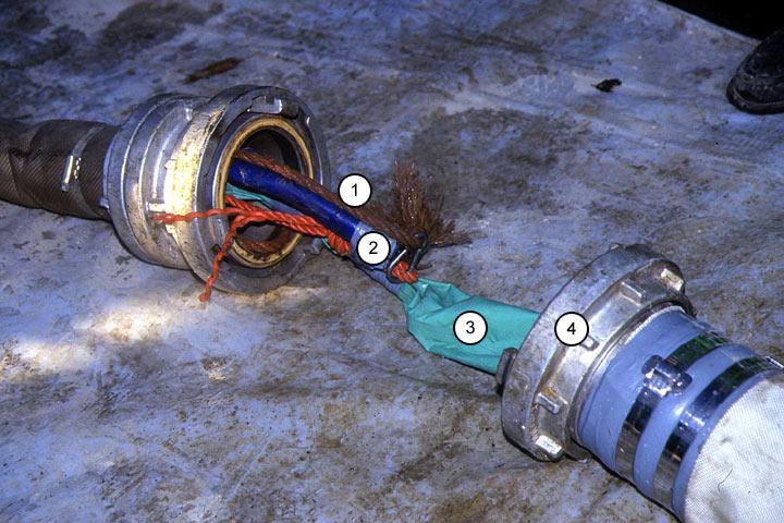 KM-Houseliner, hydraulische Variante [FI-KMG] - Detail Druckschlauch mit Endschild des Kalibrierschlauches mit angeschlossenem Heizschlauch und Zugseil |
