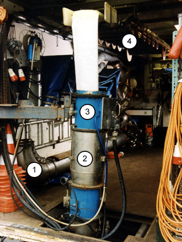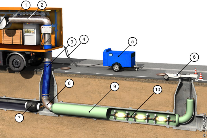 Gleichzeitig mit dem Einstülpvorgang wird ein Zugseil eingezogen. Damit wird der zur Lichthärtung erforderliche, aus sechs Lampen bestehende Lampenzug mit einer Geschwindigkeit von 30 m/h durch den weiterhin unter Druck stehenden Inlinerschlauch gezogen.